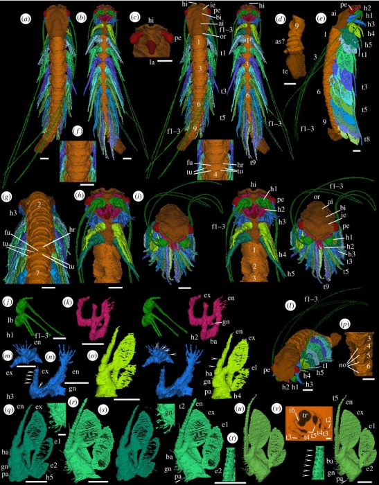 Description Holotype of Cascolus ravitis, exoskeleton and soft parts (OUMNH C.29698): (a–u) ‘virtual’ reconstructions (a,b,f,h–k,m–u are stereo-pairs); (v) specimen in rock. The exact boundary between structures such as body and limbs, as indicated by colour changes, is somewhat arbitrary. (a) Dorsal view. (b) Ventral view. (c) Anterior part of head, appendages omitted, ventral view. (d) Posterior part of trunk, appendages omitted, ventral view. (e) Right lateral view. (f) Part of trunk, dorsal view. (g) Head and most of the trunk, appendage 1 omitted, posterodorsal view. (h) Head with appendages and trunk segments 1 and 2 with appendages omitted; ventral view. (i) Anteroventral view. (j) Limb base and proximal part of antennules, right ventral oblique view. (k) Antennae, right anteroventral oblique view. (l) Anterolateral view. (m,n) Mandible, left limb: posterior oblique (m) and right anteroventral oblique (n) views. (o) Maxillula, left limb, posterior oblique view. (p) Sternites 3–6, anteroventral view, appendages omitted. (q) Maxilla, left limb, posterior oblique view. (r–t) Trunk appendage 2, left limb: gnathobase (r) and complete limb (s) posterior oblique views; and inner proximal part of endopod (t) posterior oblique medial view. (u) Trunk appendage 5, left limb, posterior oblique view. ai, axial inflation; as?, apodous segments?; ba, basipod; bi, bell-shaped inflation; e1, e2, epipods; en, endopod; ex, exopod; f1–f3, flagella; fu, furrow; hi, indentation in anterior margin of the head shield; gn, coxal gnathobase; h1–h5, head appendages; hr, half-ring of trunk tergite; ie, inflation adaxially forward of each eye (‘eye ridge’); la, labrum; lb, limb base; no, node; or, occipital ring; pa, precoxal area; pe, pedunculate eye; t1–t9, trunk appendages; te, end of the trunk, masked by extraneous matter; tr, trunk; tu, tubercle(s). Numbers refer to trunk segments and trunk tergites/sternites as appropriate. Arrows in (m-o, t) indicate podomere boundaries. Arrow in (s,u) indicates a spine/seta. Scale bars: (a–q), (s–v) are 0.5 mm; (r) is 0.1 mm. JPG file - 297.84 kB - 1 000 x 1 280 pixels added on 2017-05-051 600 viewsWoRMS taxa Cascolus ravitis Siveter, Briggs, Siveter, Sutton & Legg, 2017 †checked Mees, Jan 2017-05-05