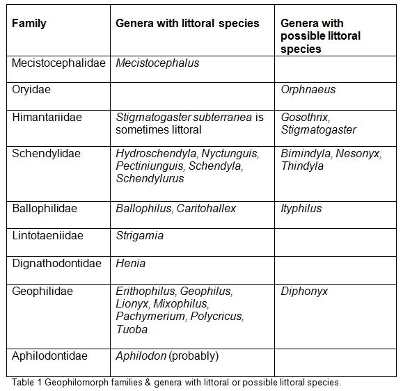 Possibly up to nine families of this order contain apparently halophilic species and within these are 17 (probably more) genera containing halophilic species (Table 1). The total number of halophilic geophilomorphs recorded in a recent list (Barber, 2009) is 45. Most of these are from Europe, Western United States, the Caribbean, South America, Japan and Australia/New Zealand. There are few records from the Atlantic coast of USA or from Canada, very few African records and little from much of Asia other than Japan, Korea and Taiwan. It is highly improbable that there are no species occurring on these coasts. In addition it is possible that some species for which no habitat data is given (e.g. for California / Baja California, South Africa, New Zealand) may well be halophilic and also finding littoral species in some habitats (e.g. rock crevices) is not always easy. An estimate of 100 plus species from around the world seems reasonable. There are certainly reports in the literature of seashore centipedes where the species was not identified: Cape Verde Is, Galápagos, Colombia, Panama, Costa Rica (Crossland, 1929, Polhemus & Evans, 1969). Probably there are as yet undescribed littoral species in collections and it is quite likely that some described species where habitat was not given may well be littoral.
